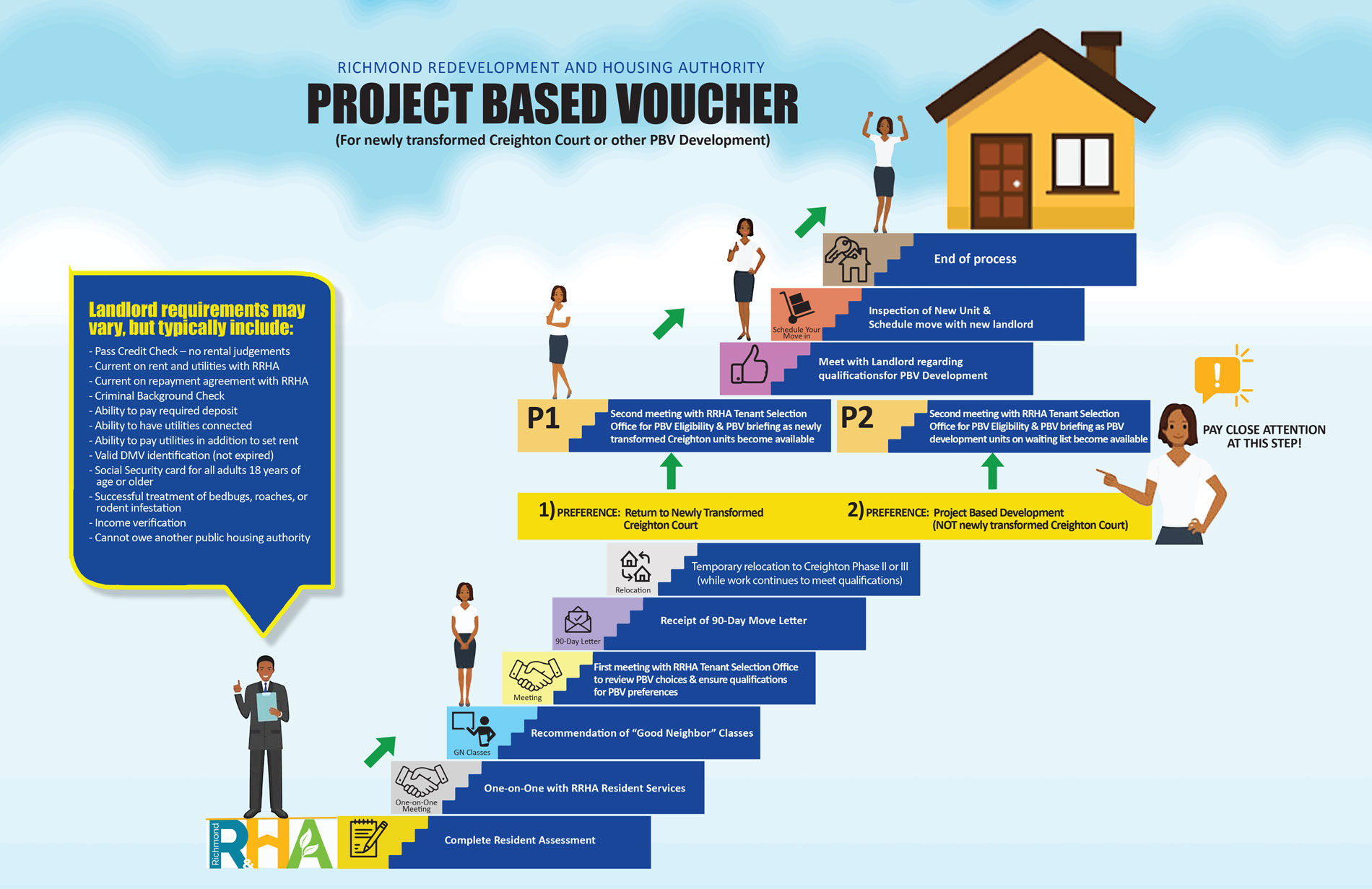 A PBV is a housing choice voucher where the subsidy stays with the unit, not the individual voucher holder. Applicants must apply for specific communities and will then be placed on that community’s site-based waiting list managed by RRHA.