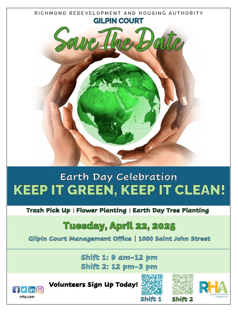 For more information about Earth Day at Gilpin Court, please contact RRHA’s Customer Call Information Center at (804) 780-4200 or toll free at 833-750-7742 (RRHA) or email info@rrha.com.