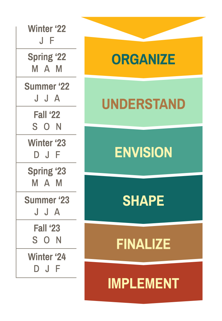The planning team will provide updates on the process in a large format meeting where community members will have an opportunity to ask questions, provide input during each phase of the planning process, and engage with the design and development of the final community plan.