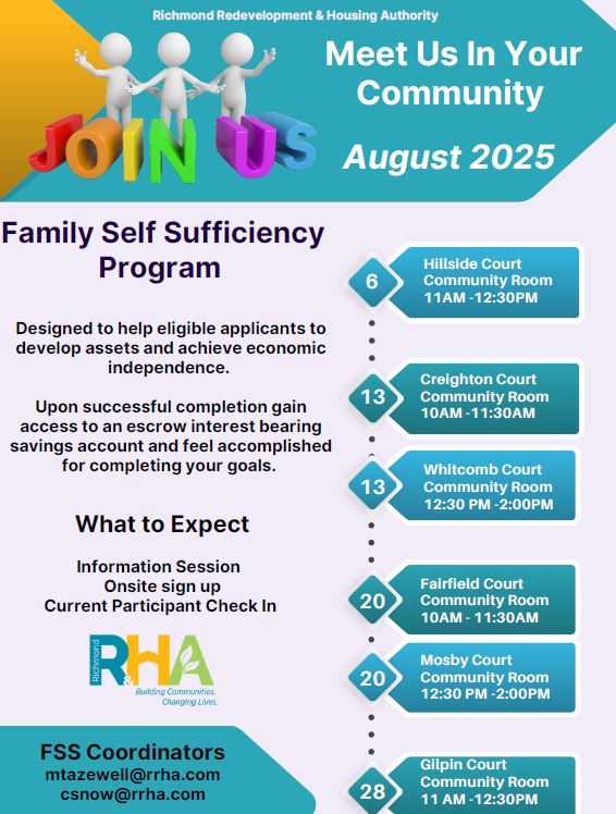 Home Calendar Family Self Sufficiency Program Family Self Sufficiency Program Date Wednesday, Aug 13, 2025 Expired! Time 10:00 am - 11:30 am Organizer RRHA Phone 804-780-4200 Email info@rrha.com Next Occurrence Go to occurrence page Date Aug 13, 2025 Time 12:30 pm - 2:00 pm Share this event